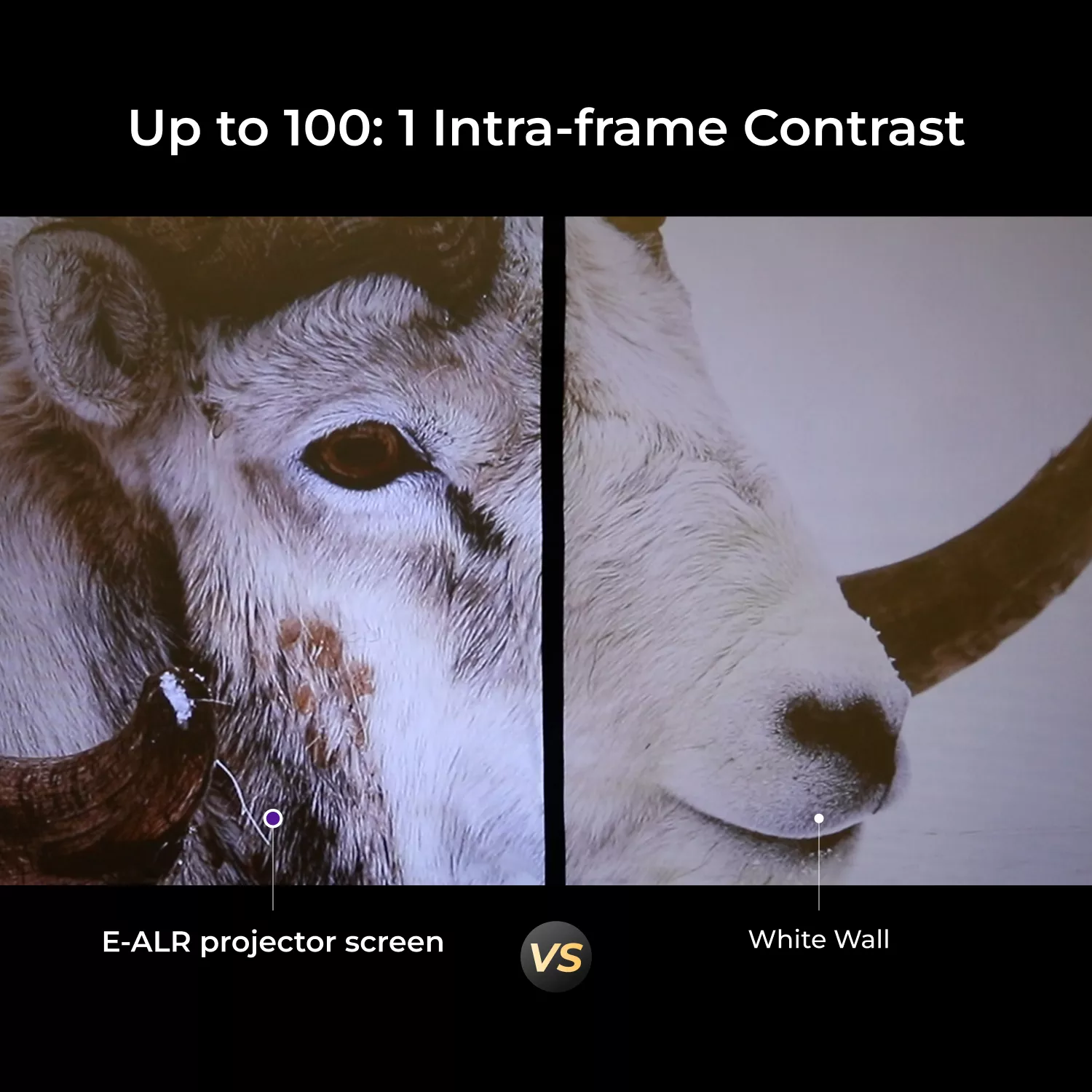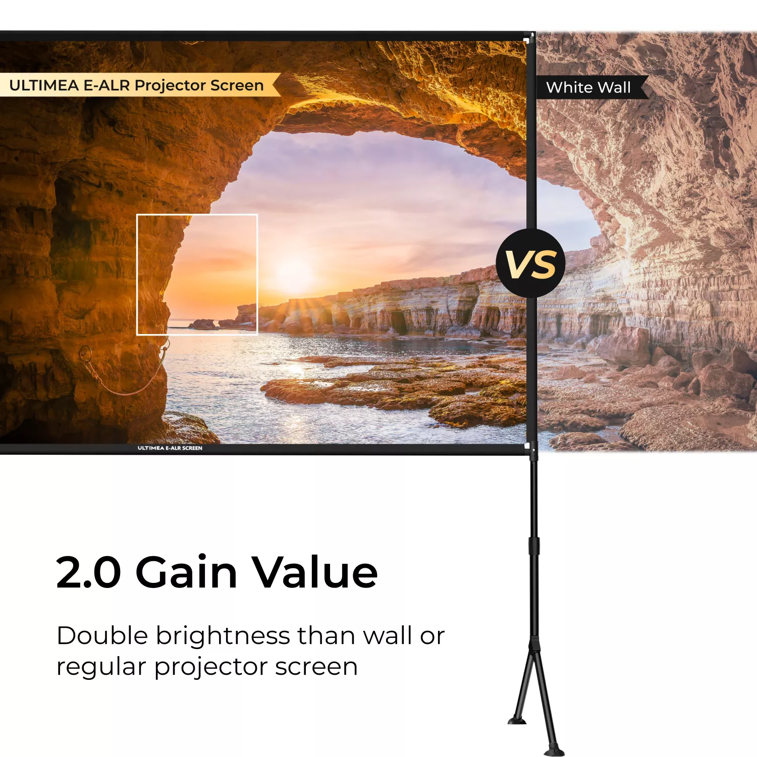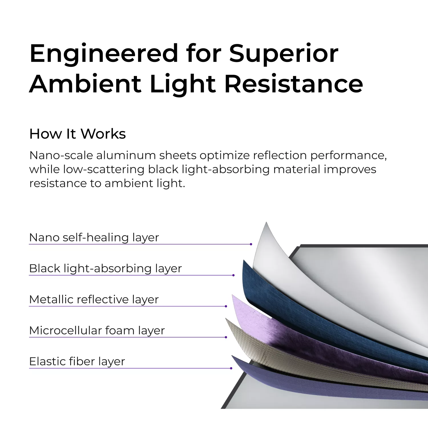 The revolutionary feature is its 2.0 gain value that doubles image brightness while rejecting 80% of ambient light. Unlike traditional white screens that scatter light in all directions, this screen uses advanced E-ALR technology to reflect more projected light directly back to the viewer while filtering out light from ceilings, windows, and lamps. This means you get images that are twice as bright as a standard white wall or basic screen, with rich colors and deep blacks that maintain their impact even when room lights are on or sunlight streams through windows.
