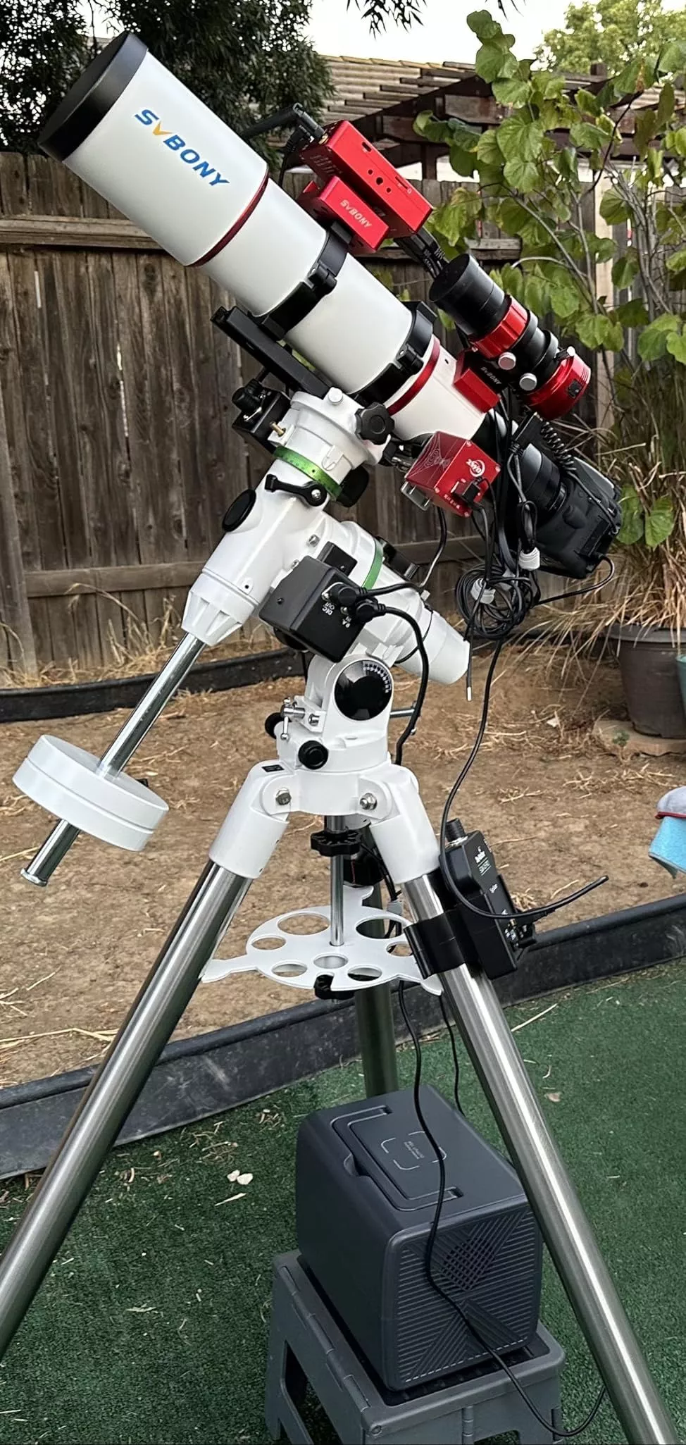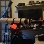 It is a little on the heavy side (14 lb/6.4 kg vs 12 lb/5.4 kg for the SCT) but it’s not too much for a senior citizen like me to handle. It has a nice long dew shield that extends and retracts smoothly. I use the manual focuser with a Bahtinov mask as a focus aid. It dials in smoothly and maintains focus once set. With the 1.0x field flattener, the stars are sharp and round points of light all across the field of view. In comparison with the 8″ SCT with a 0.63x focal reducer, the quality of the images has improved greatly. In comparison with the SV550 80 mm telescope, it has over twice the light-gathering capability, so I am able to get more detail in my images during a single night of photography. The only down-side is that it is pretty long, but that is to be expected with a refractor with a wide aperture. With the dew-shield extended and my camera attached, it is 43 inches (109 cm) long, which means that I have to be much more careful as the telescope approaches the meridian. However I have safety features set up to avoid collision with the tripod legs so it isn’t a deal breaker. All in all, I am extremely happy with this telescope and expect to get many years of great images with it.
