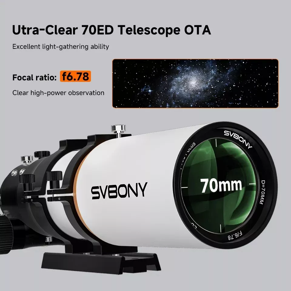 Unlock the magic of the night sky with this high-performance 70mm ED refractor telescope, specially designed for those who demand precision and clarity. Whether you’re an amateur stargazer or a serious astrophotographer, this telescope delivers rich contrast, true-to-life colors, and pin-sharp stars. It’s built for deep sky imaging, lunar observation, and capturing breathtaking nebulae—making it the perfect companion for your celestial adventures.