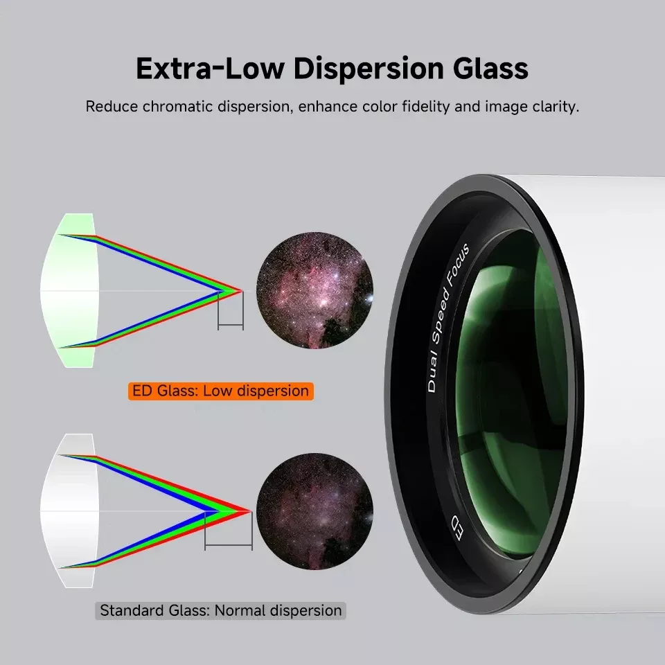 Crafted with extra-low dispersion (ED) glass and a doublet air-spaced achromatic lens system, this telescope corrects color fringing and chromatic aberration, giving you crystal-clear images every time. The built-in flat-field corrector ensures a smooth, distortion-free field across your entire image, especially ideal for APS-C sensors. Ultra-wideband SMC coatings enhance light transmission, giving you brighter and higher-contrast images even in low-light conditions.