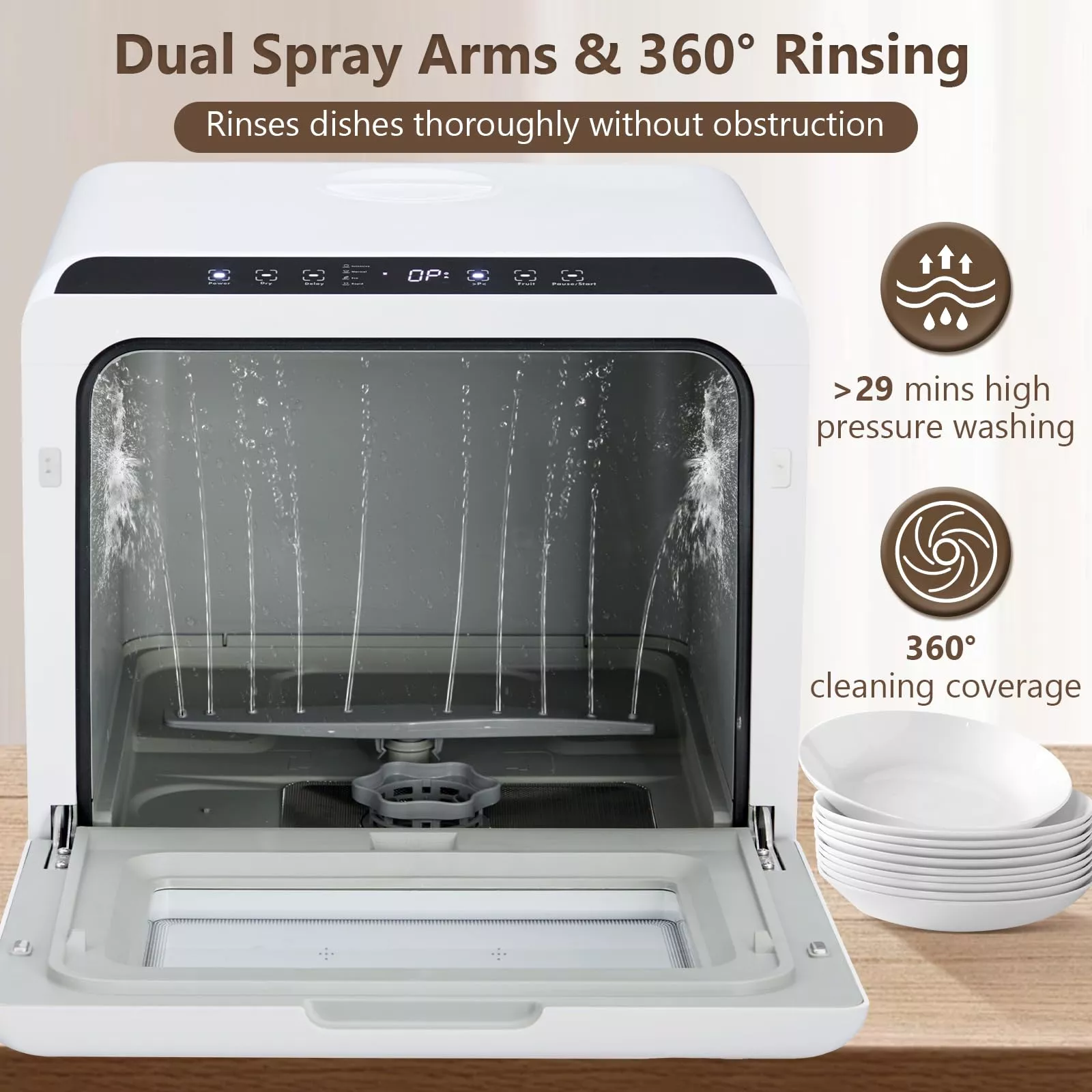 Make dishwashing a breeze with our compact countertop dishwasher, designed to fit seamlessly into any lifestyle. With its sleek, space-saving design, this portable dishwasher is the perfect solution for small homes, apartments, dorms, boats, and RVs. Its double-layer interior can accommodate up to four full place settings and dishes as large as 12 inches, ensuring practicality without compromising on capacity. Whether you’re hosting dinner for friends or tackling everyday chores, this dishwasher is a game-changer for busy households of 3-4 people.