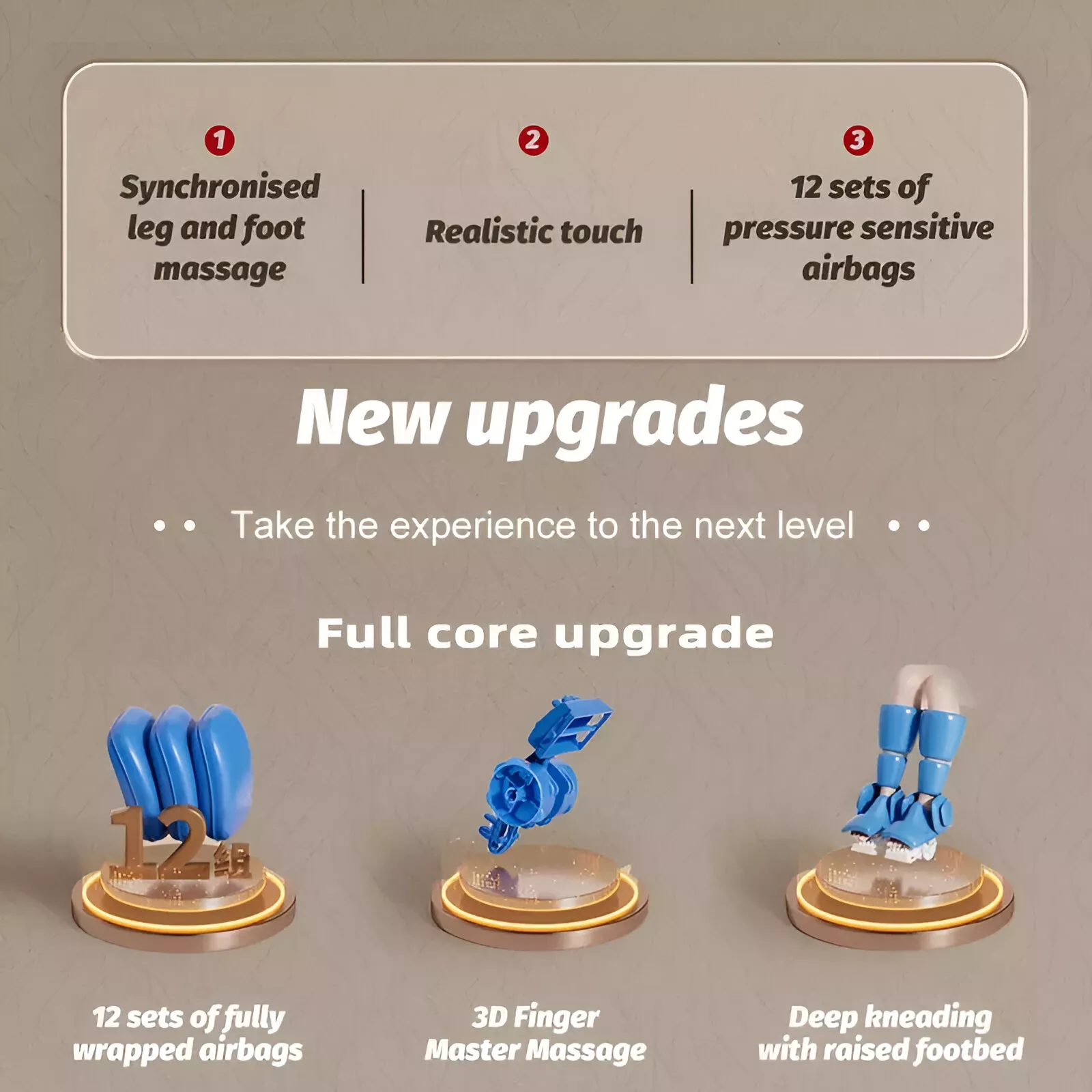 - 8D Air Compression: Targets calves and feet with rhythmic squeezing to boost circulation