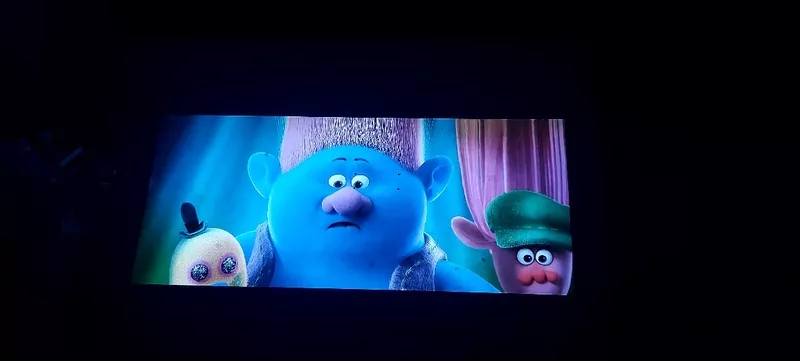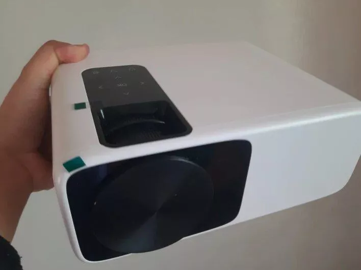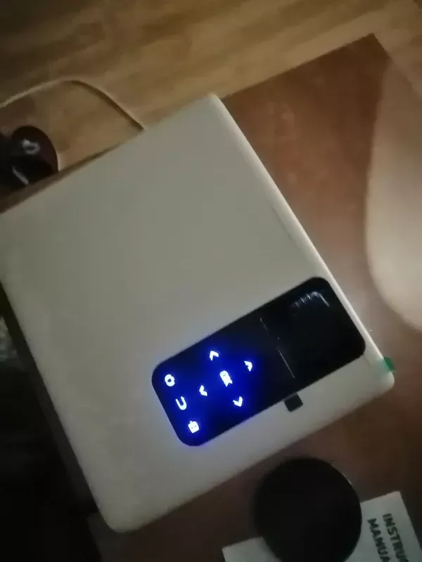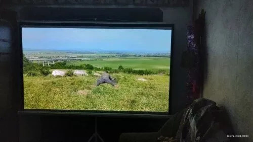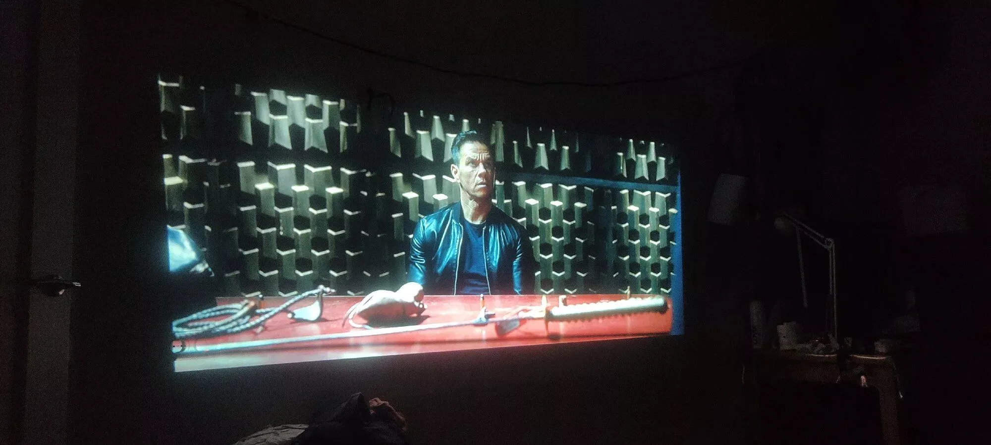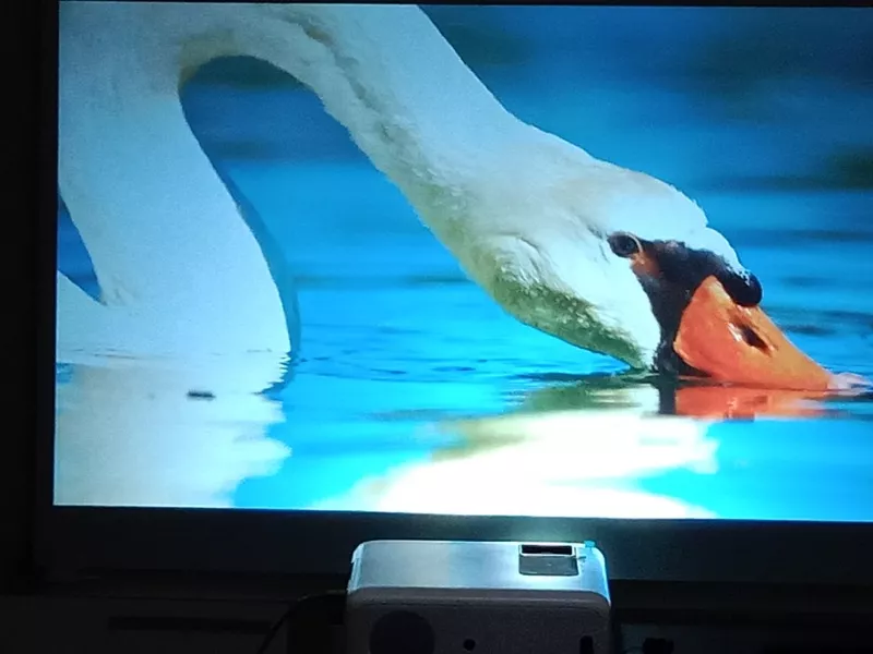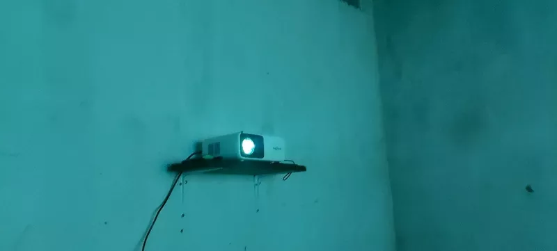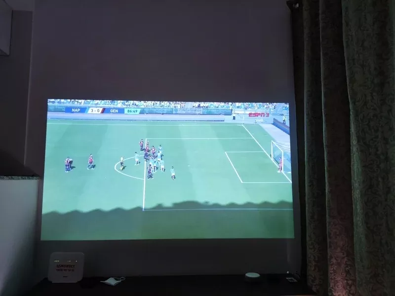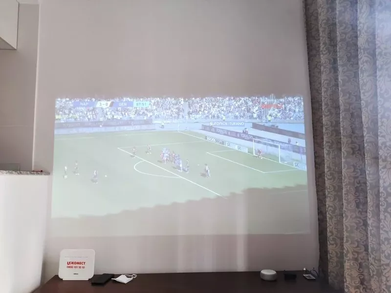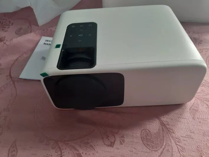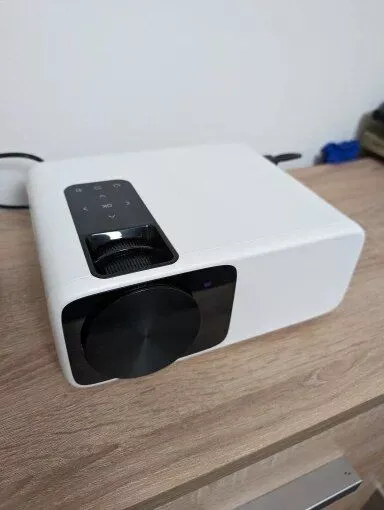 The projector connects to Wi-Fi (2.4) right away but doesn’t seem to see the 5G network for some reason. The picture is quite nice, colors are good (red is actually red, green is actually green). The picture is clear if you place it exactly parallel to the projection surface. There are no spots, the image is clear across the entire screen area, no lights or blackout. The built-in speaker surprised me; the sound quality is good and quite loud without wheezing or slurping. For a 193 sq ft room, it’s more than enough. The fan noise is not loud, you stop noticing it after 2 minutes.