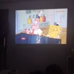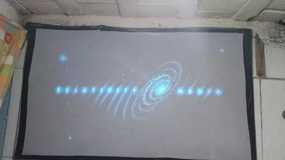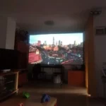 The projector is about 13 feet from the wall, and the image is roughly 10 feet by 5 feet. Right now, it’s just projecting onto a gray wall, but the image quality is pretty good. Surprisingly, the sound has a lot of depth. I hooked up a TV android box to it. Overall, I’m very pleased; this is my first projector.
