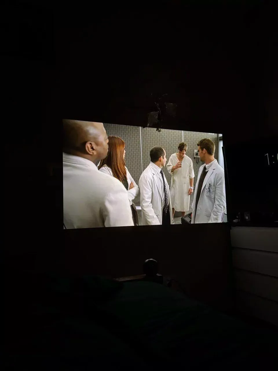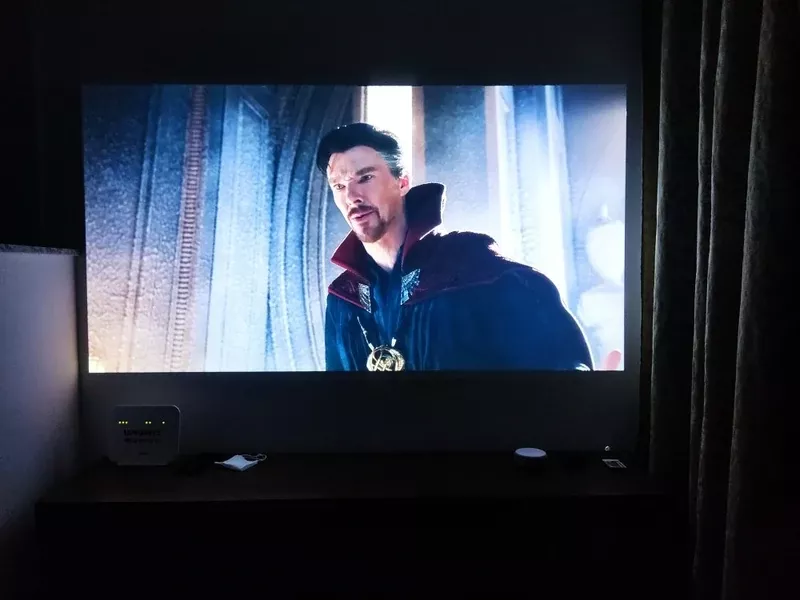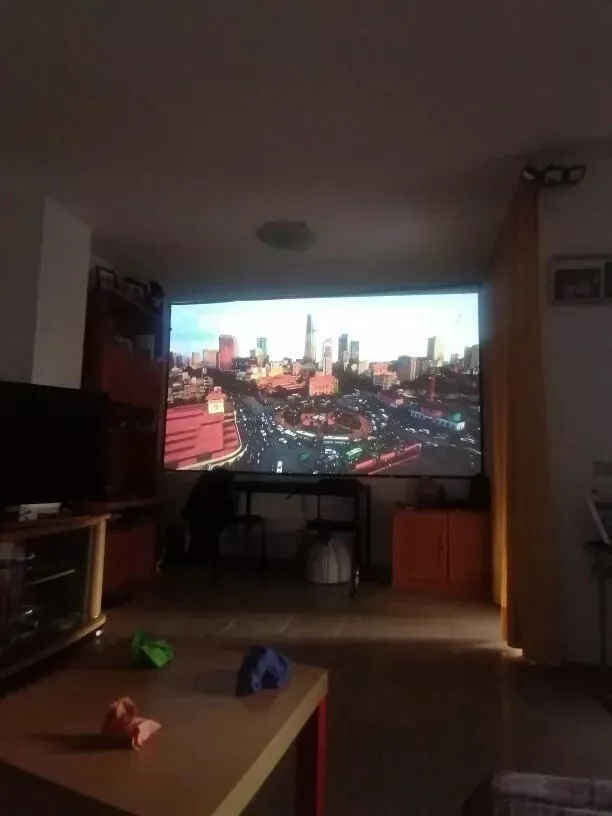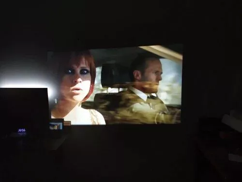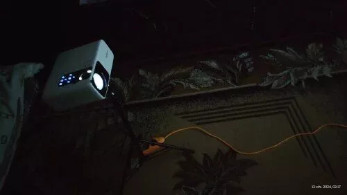 Great image transmission in the dark, large screen, the image is clearly visible on beige textured wallpapers. Works great directly through HDMI with a laptop or YouTube from a phone via Wi-Fi. Possibly flash drive too, but I don’t need that feature. In the video, the distance is about 10 feet, positioned almost exactly (off by about an inch). If you raise it higher, the left edge starts to blur. Dust gathers quickly on the lens; if you watch movies with many dark scenes, they are visible 😅. The built-in speakers are quite ok for a room of about 215 square feet; planned on a speaker, but it was unnecessary for me. Easy to set up, needs AAA batteries for the remote (not included). Overall, I think it’s an excellent purchase and recommend it. It was delivered on time and in perfect condition.