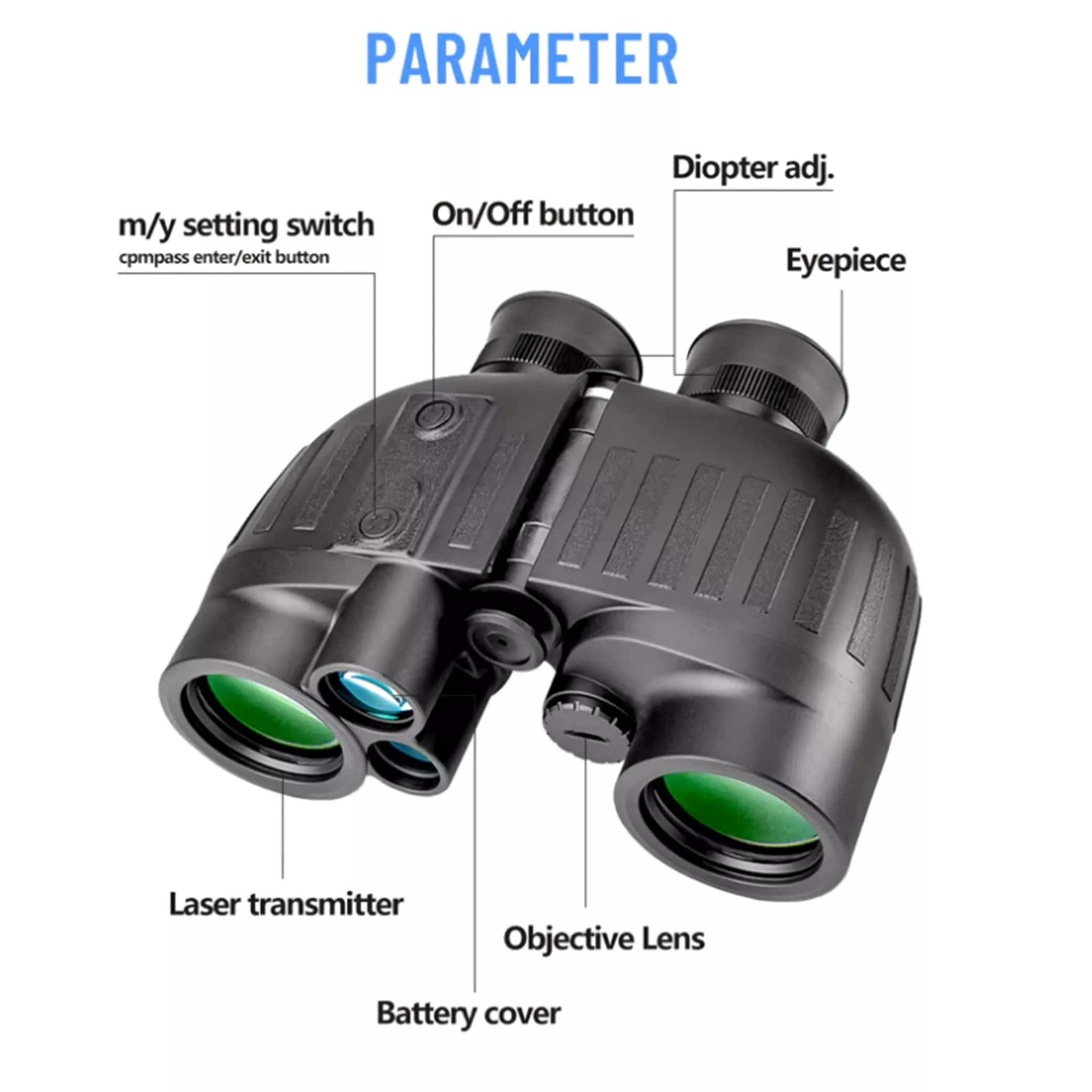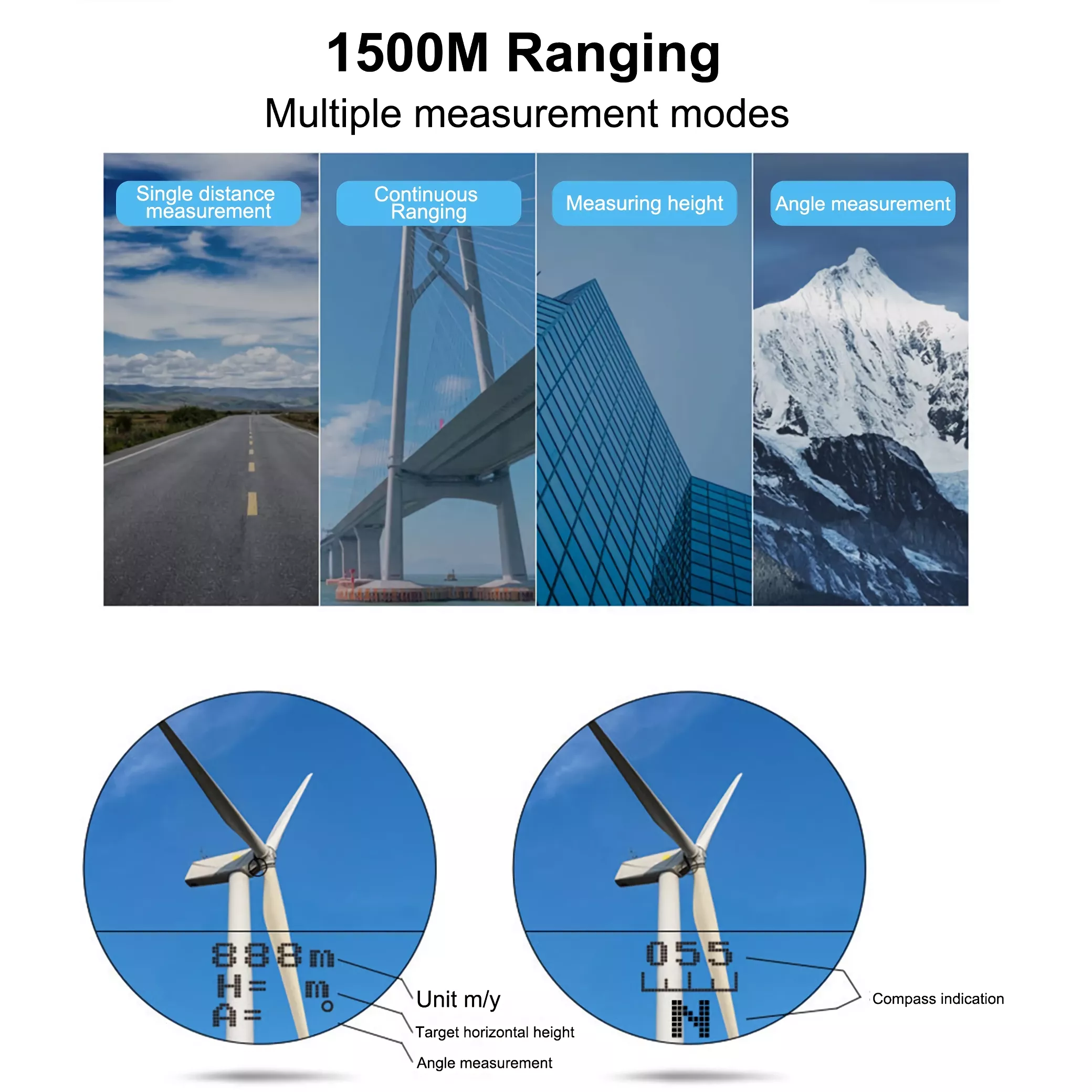 Our binoculars combine high-definition optics with robust, user-friendly features. The rangefinder is based on the TOF (Time of Flight) principle, using a 905nm pulsed laser for accurate measurements up to 1500m (approximately 1640 yards). The built-in electronic compass provides real-time azimuth measurements, making it an indispensable tool for navigation and orientation.