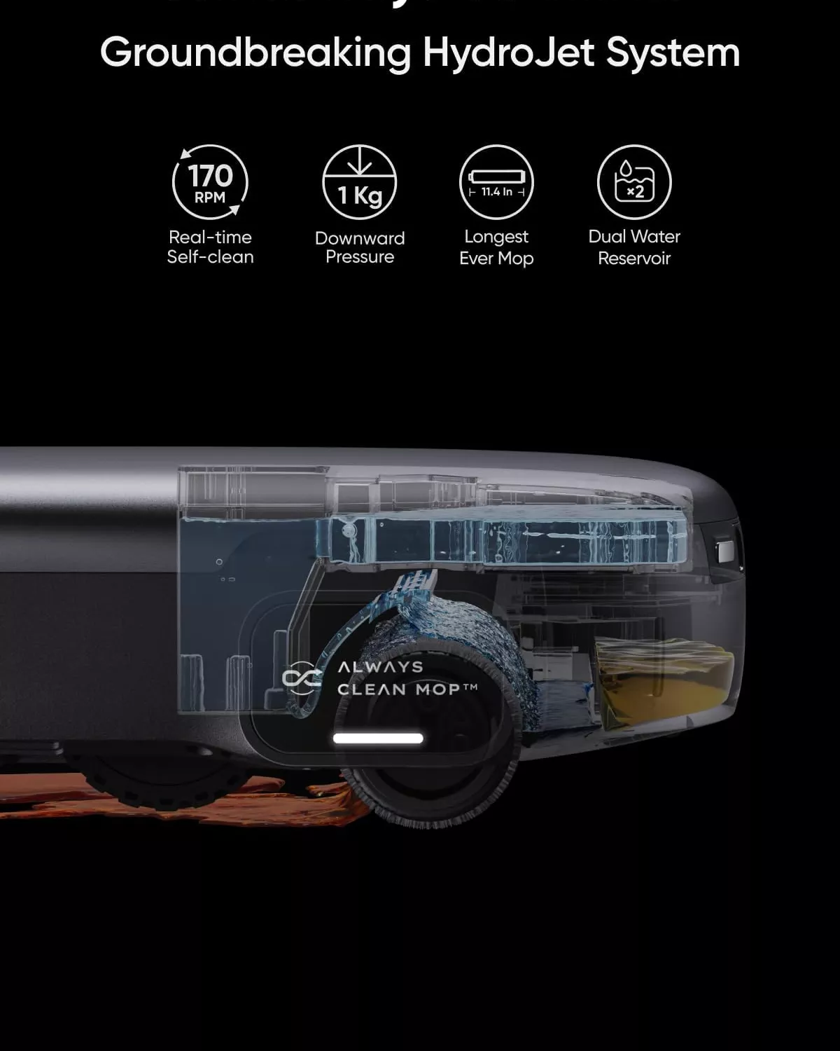 - HydroJet Cleaning: Real-time mop self-cleaning with high-speed spinning and downward pressure.
