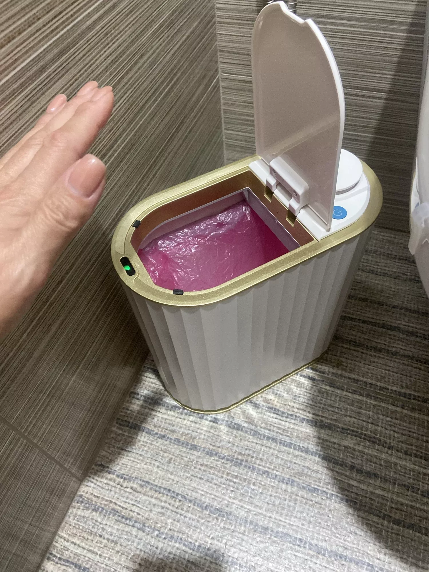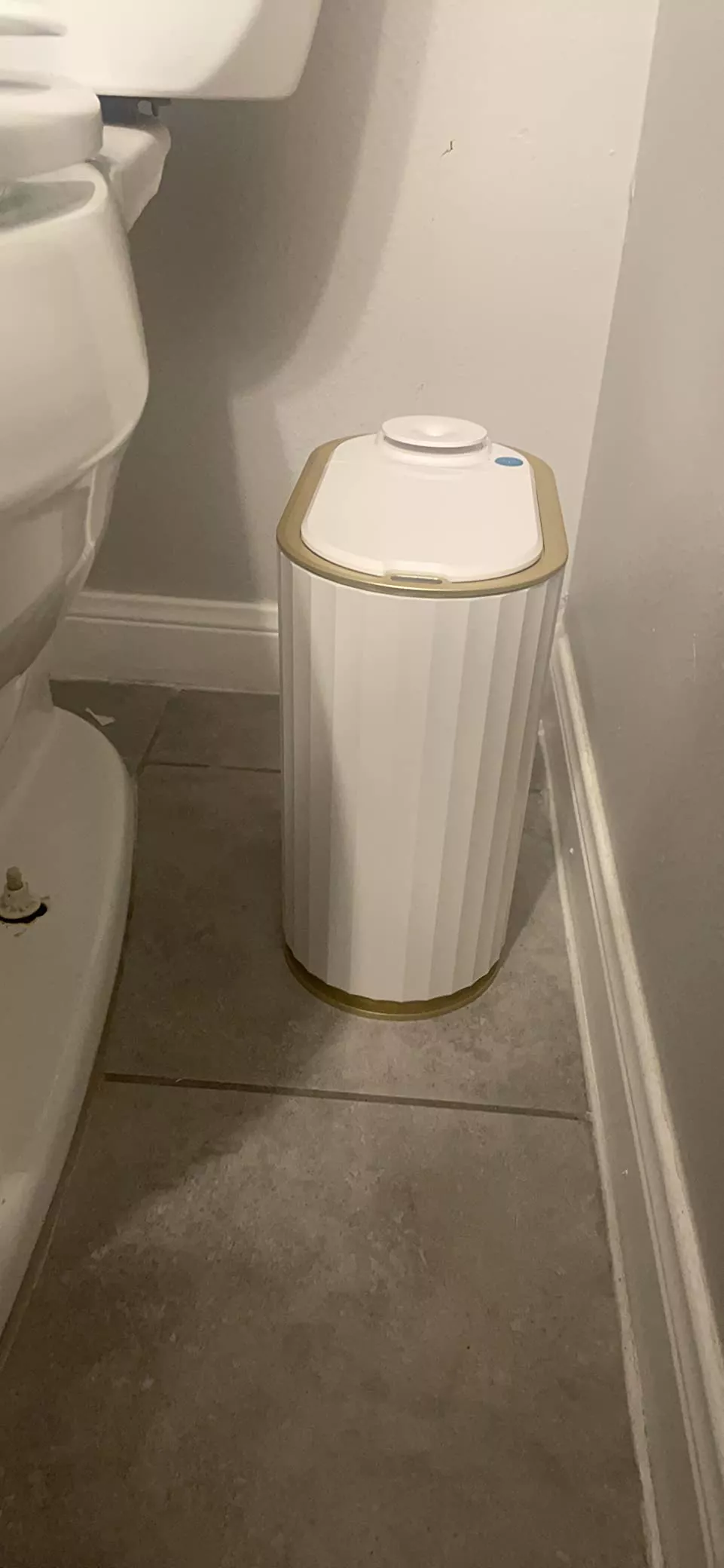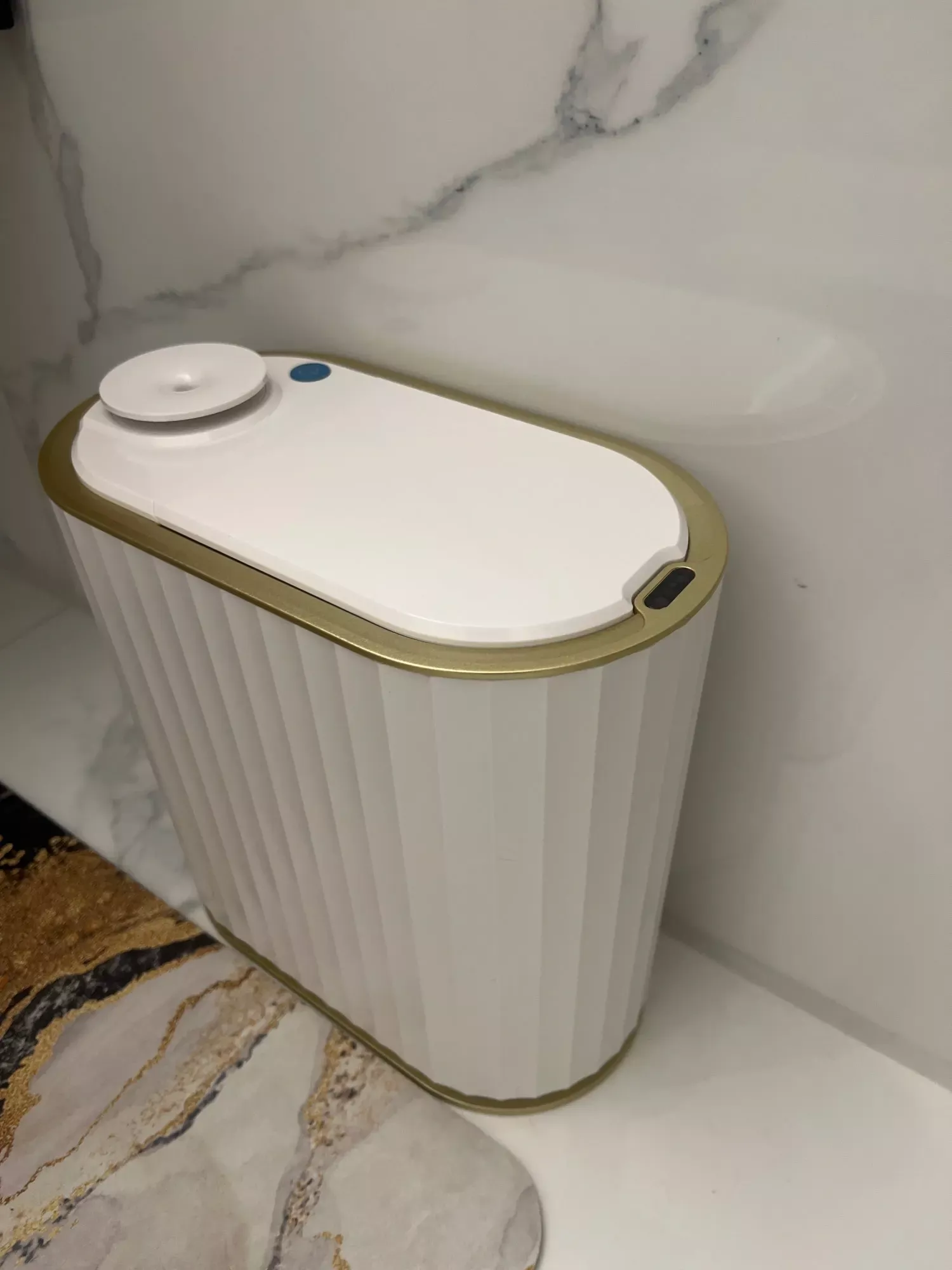 I never thought I’d call a trash can beautiful, but this one is! The white with gold trim looks elegant and sleek. I don’t mind it being out in the open in my bathroom. The motion detection feature is convenient, helping to keep the lid clean. It’s the perfect size for under a desk or in a restroom.