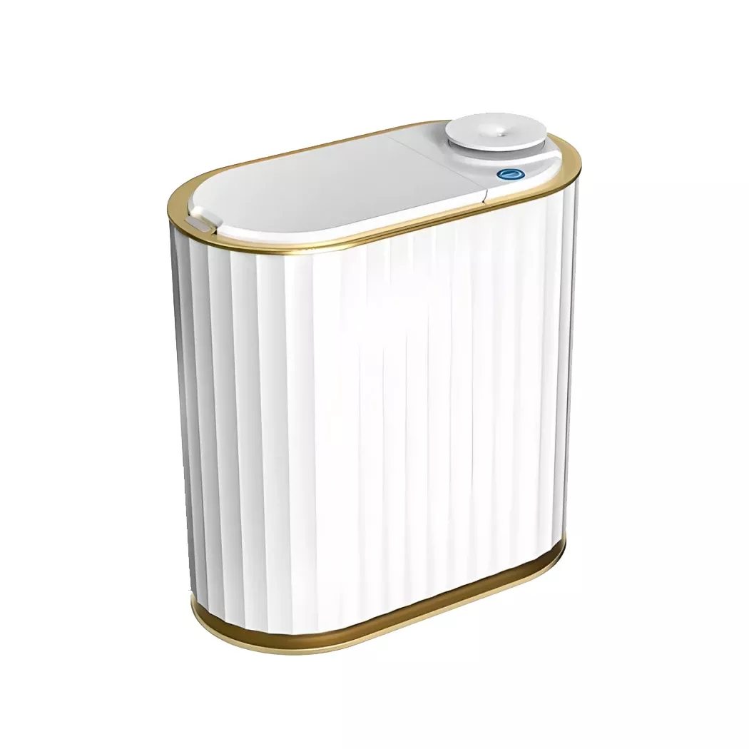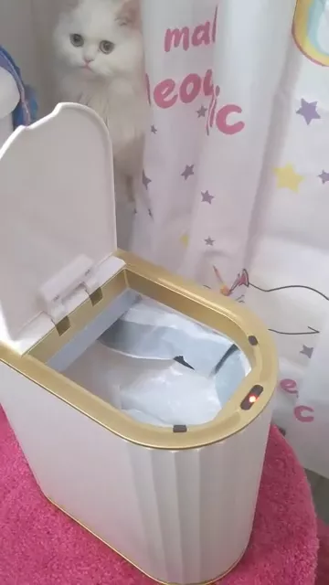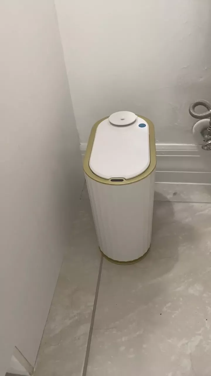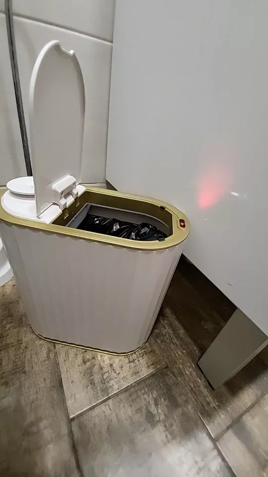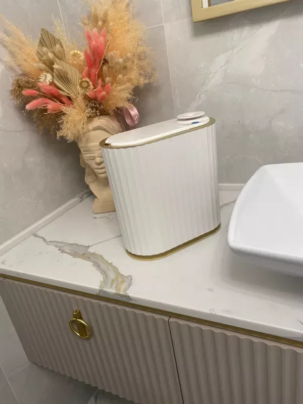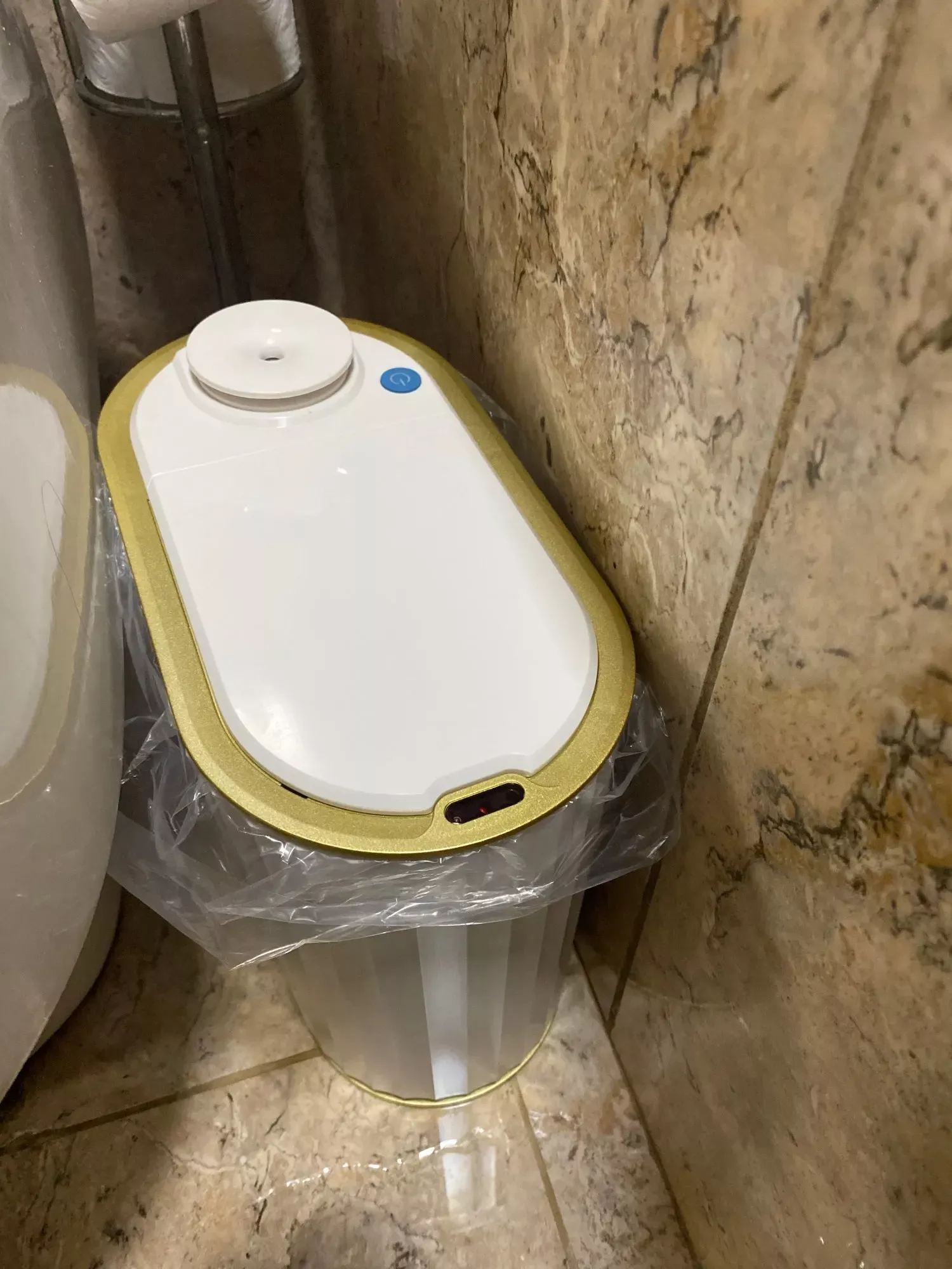 I never thought I’d call a trash can beautiful, but this one is! The white with gold trim looks elegant and sleek. I don’t mind it being out in the open in my bathroom. The motion detection feature is convenient, helping to keep the lid clean. It’s the perfect size for under a desk or in a restroom.