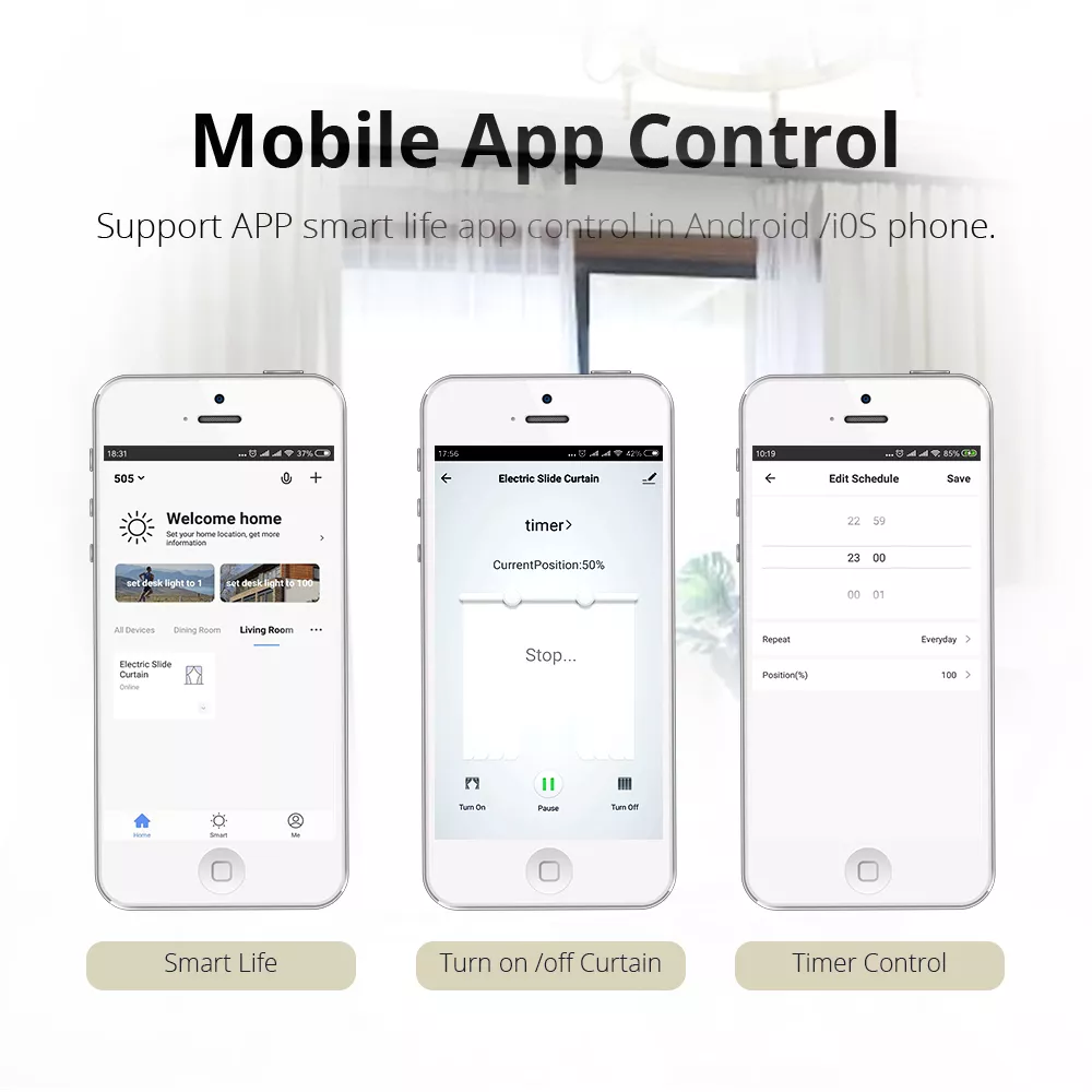 Whether it’s your living room, bedroom, or office, our Smart WiFi Motorized Curtain Track is versatile enough to suit any space. Set the perfect ambiance for movie nights, protect your privacy, or simply enjoy the luxury of automated curtains. With the ability to schedule operations, you can ensure your curtains always function according to your lifestyle needs.